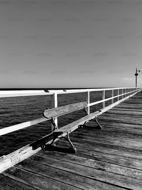 A weathered wooden pier stretches toward the horizon, its planks etched with years of sun and salt. A long, rustic bench sits quietly along the railing, facing the open water as if waiting for someone to pause and breathe. The monochrome tones highlight the textures—the grain of the timber, the calm ripples of the sea, and the vast, open sky above. Still, peaceful, and beautifully simple, the scene captures a moment of solitude by the water’s edge.