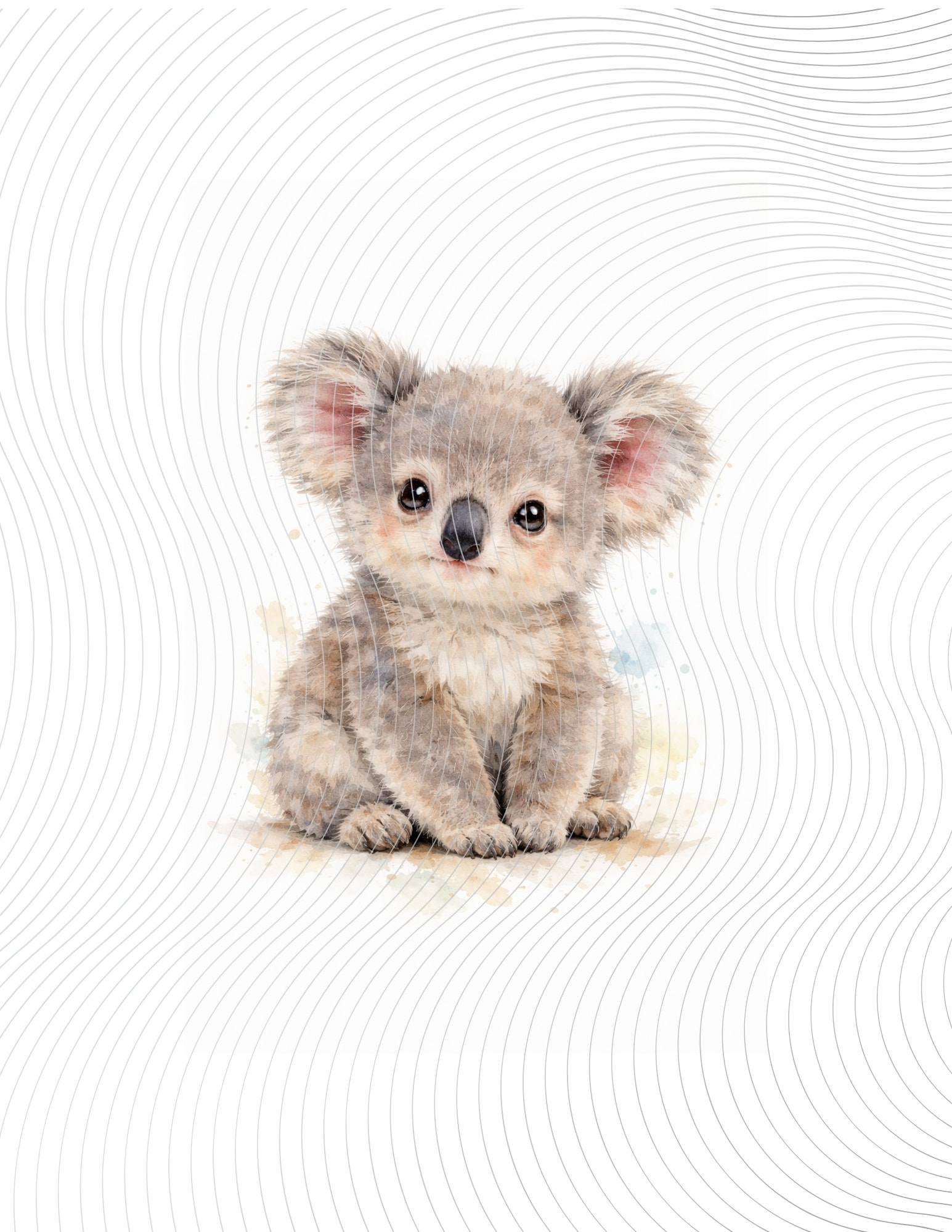 A soft watercolor baby koala with fluffy fur, rosy cheeks, and big gentle eyes, sitting sweetly and radiating calm cuteness.