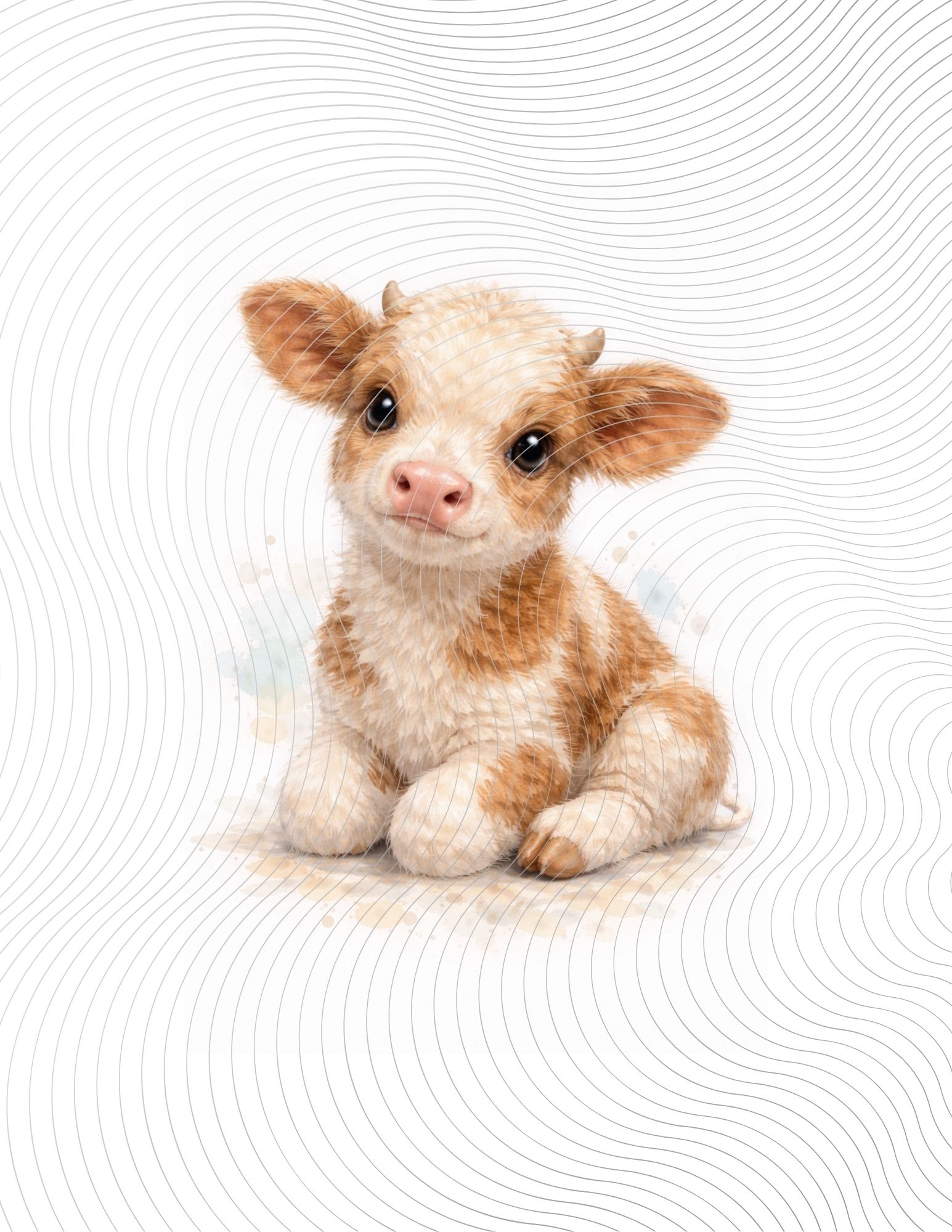 A fluffy baby cow with soft brown-and-white fur, big gentle eyes, and watercolor charm, sitting sweetly and curiously.