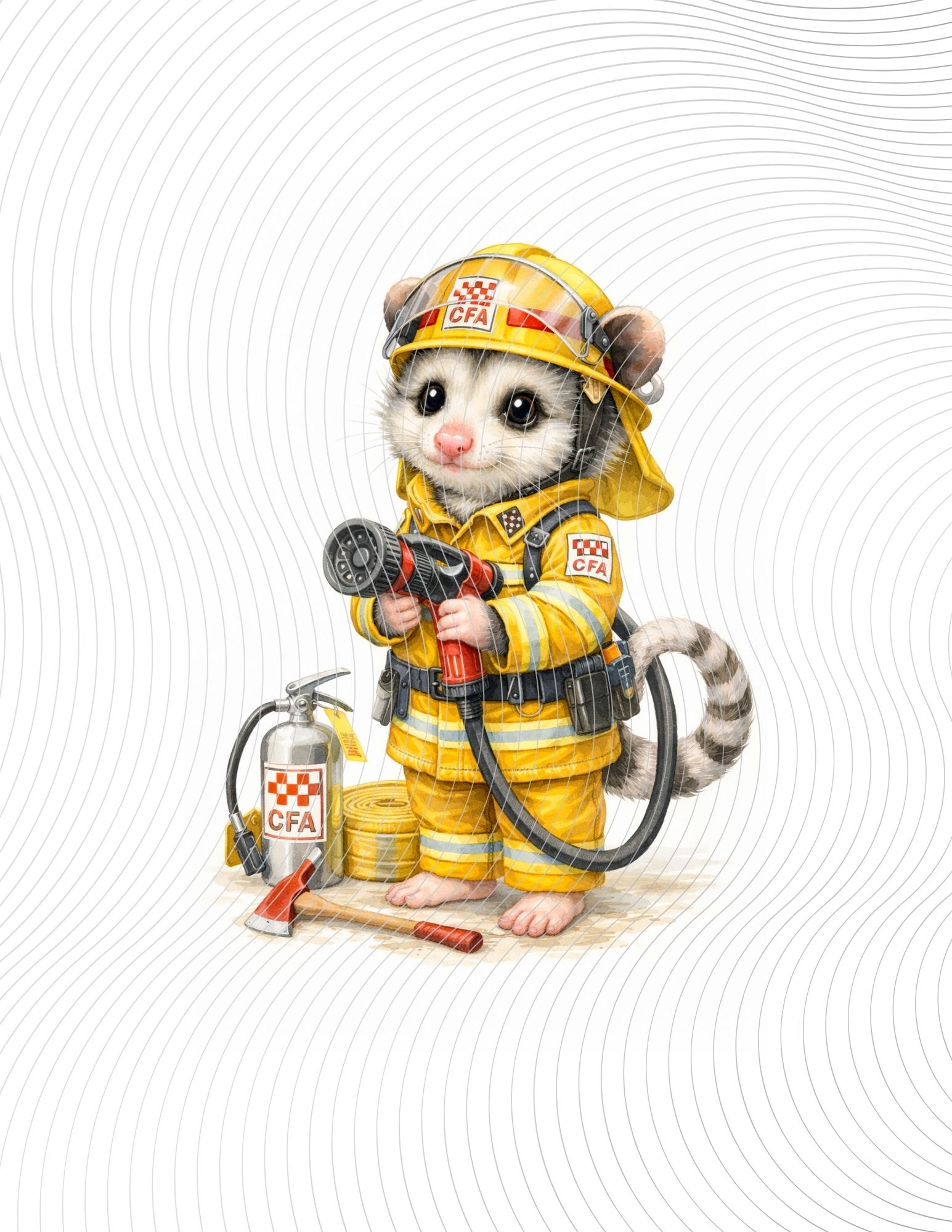 A baby possum firefighter in yellow CFA gear, holding a hose, surrounded by firefighting tools, painted in detailed watercolor.