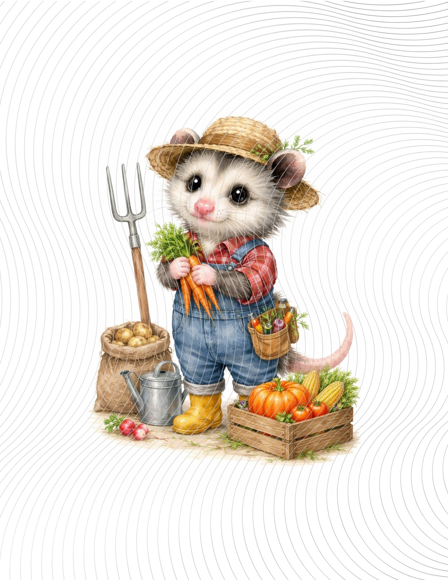 A baby possum farmer in overalls and straw hat, holding carrots beside fresh vegetables, garden tools, and rustic farm charm.