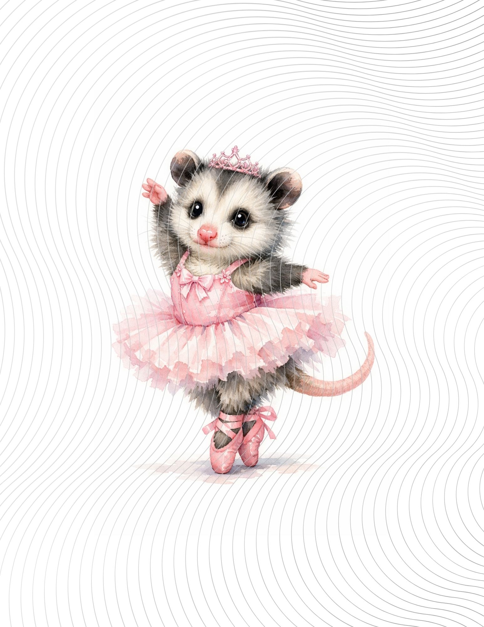 A baby possum ballerina wearing a pink tutu and tiara, dancing gracefully on pointe in soft watercolor style.