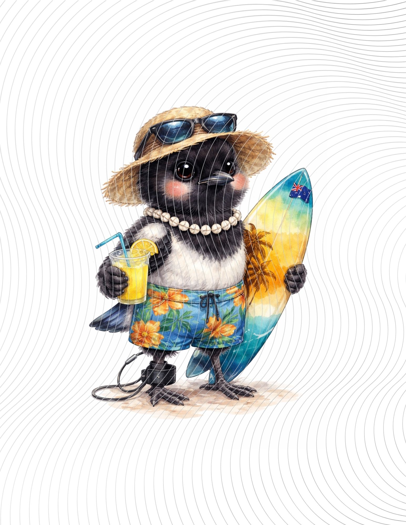 A baby magpie surfer wearing floral shorts and sunglasses, holding a surfboard and drink, illustrated in playful watercolor style.