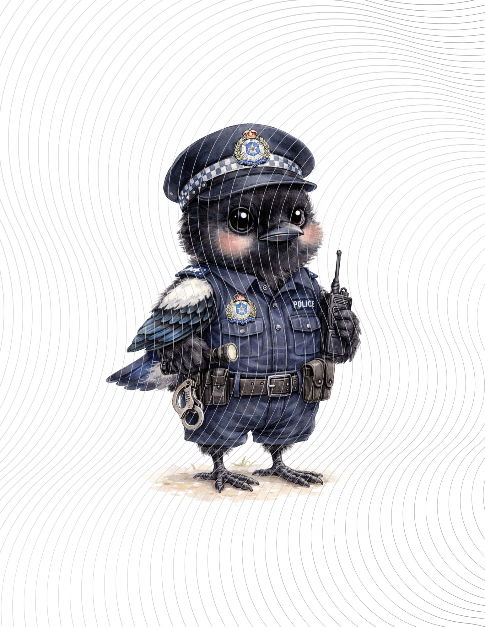 A baby magpie police officer in uniform, holding a radio and flashlight, with big eyes and detailed watercolor charm.