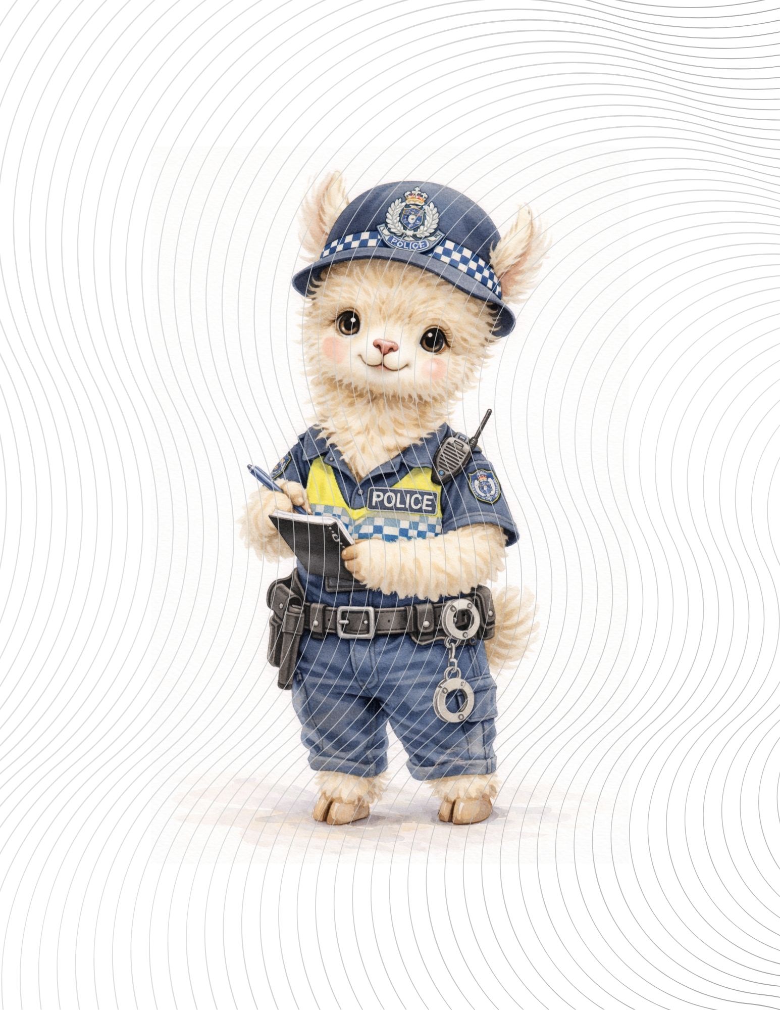 A baby llama police officer in uniform, smiling while taking notes, illustrated in soft, friendly watercolor style.