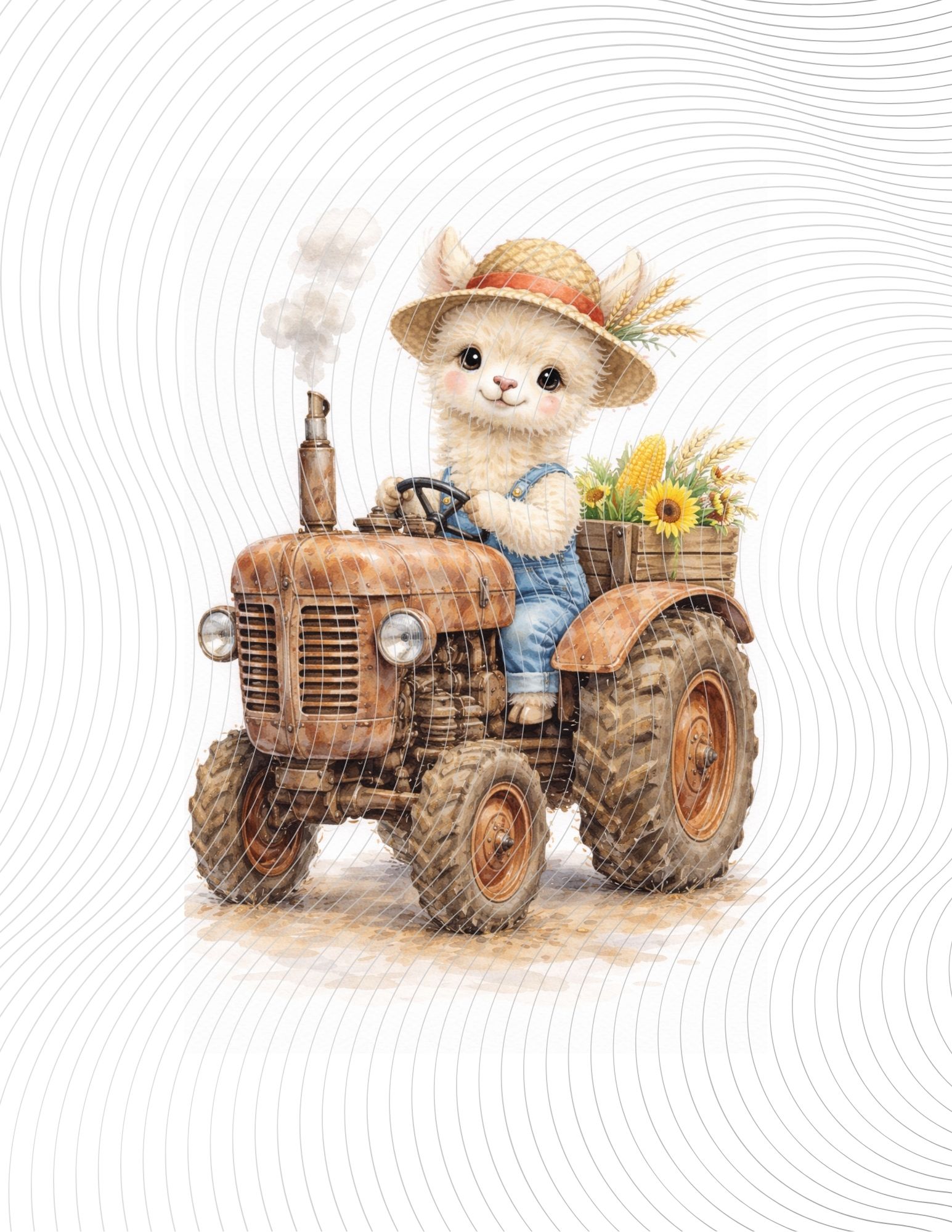 A baby llama farmer driving a rusty tractor, wearing overalls and straw hat, illustrated in warm, cheerful watercolor style.