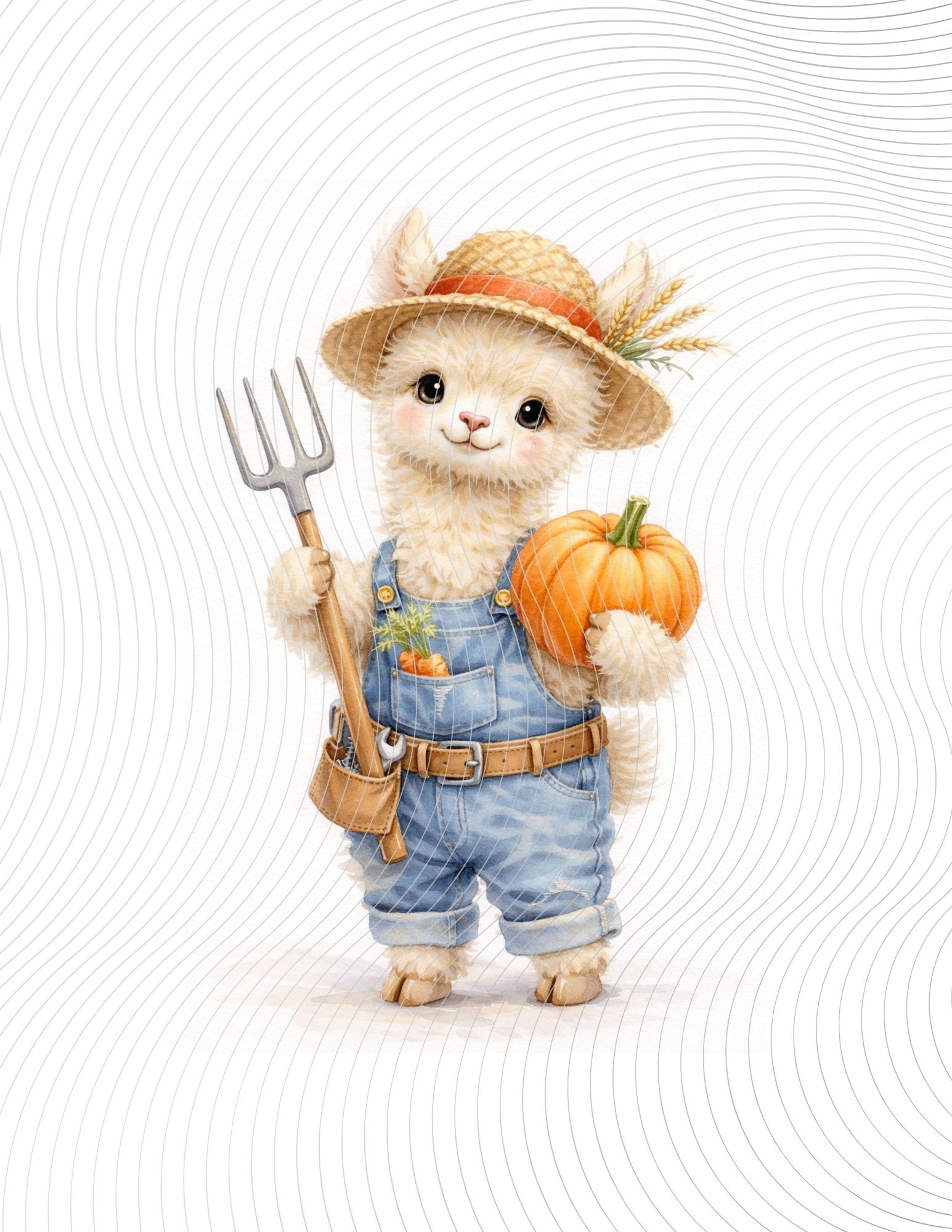 A baby llama farmer in overalls and straw hat, holding a pumpkin and pitchfork, painted in warm, gentle watercolor style.