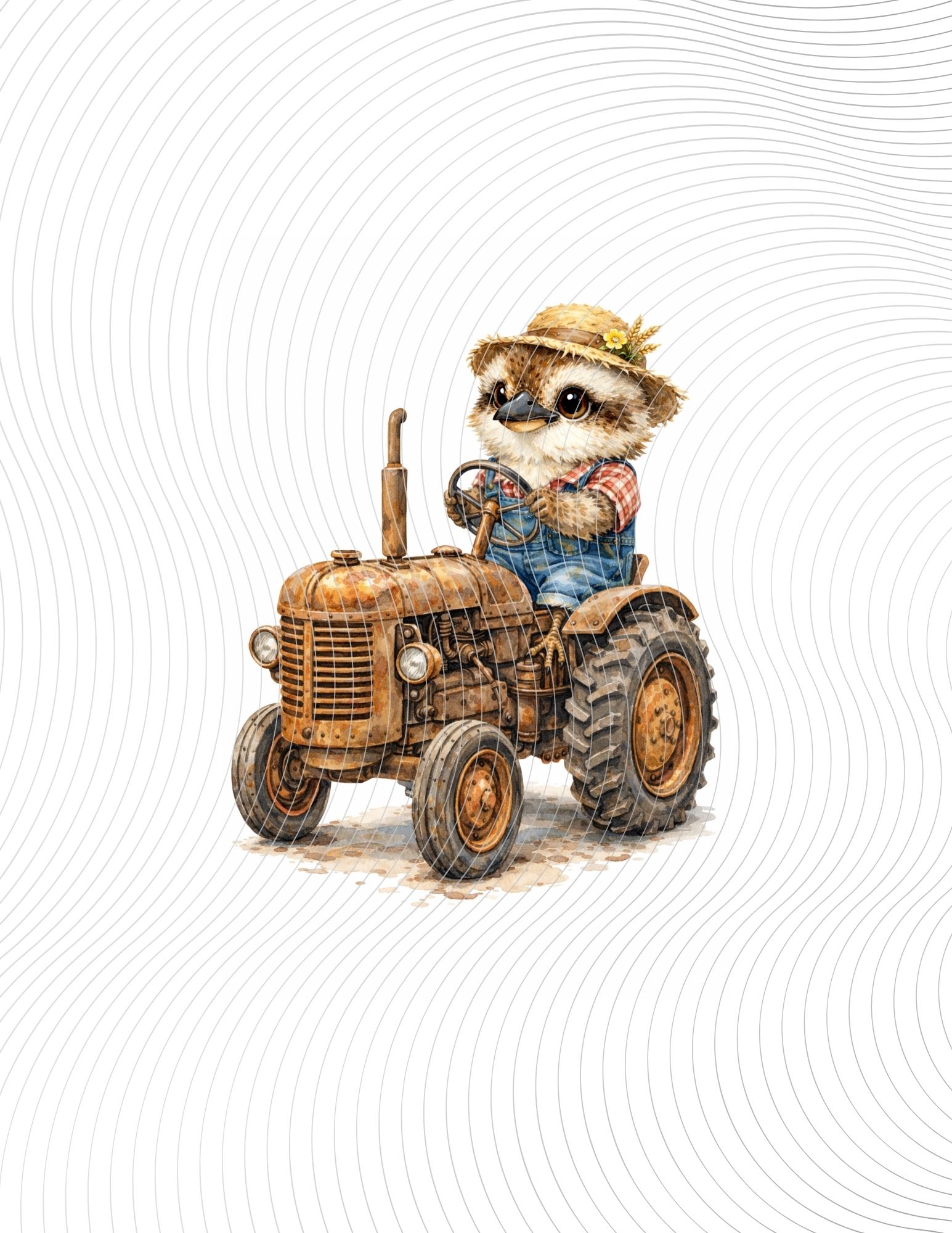 A baby kookaburra farmer driving a rusty tractor, wearing overalls and straw hat, painted in warm, whimsical watercolor style.
