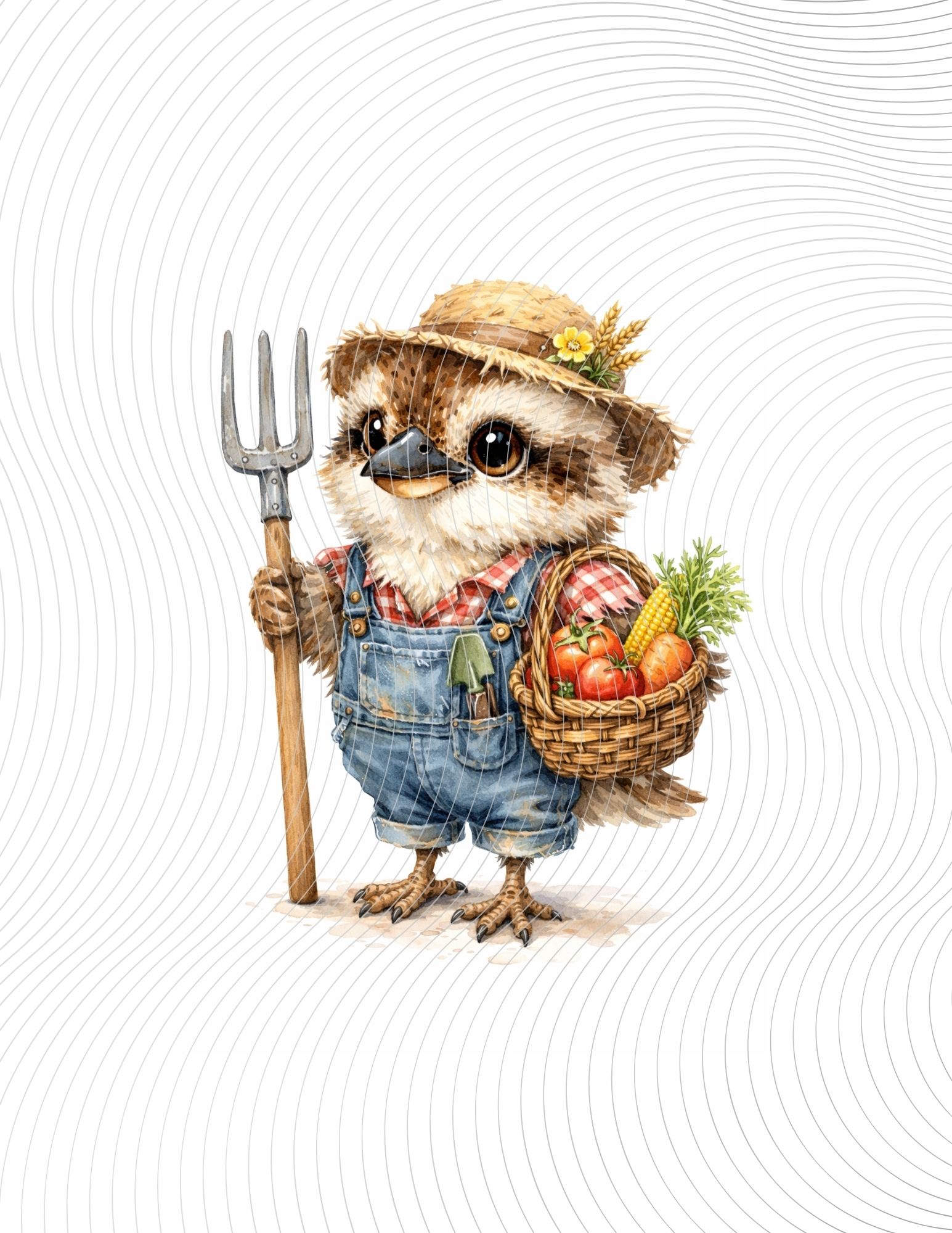 A baby kookaburra farmer in overalls and straw hat, holding a pitchfork and basket of vegetables, illustrated in warm watercolor style.
