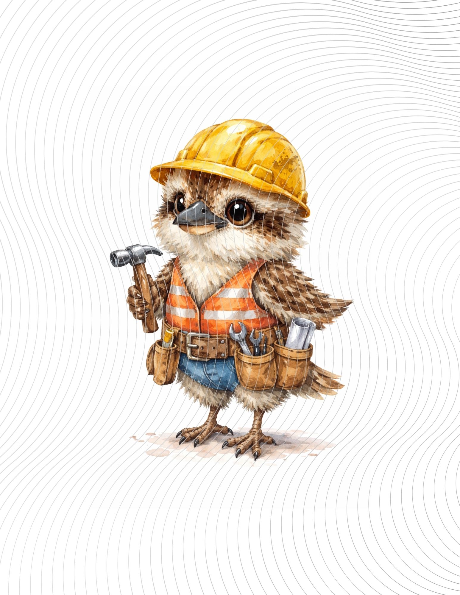 A baby kookaburra construction worker wearing a hard hat and safety vest, holding a hammer, with a tool belt, painted in watercolor.