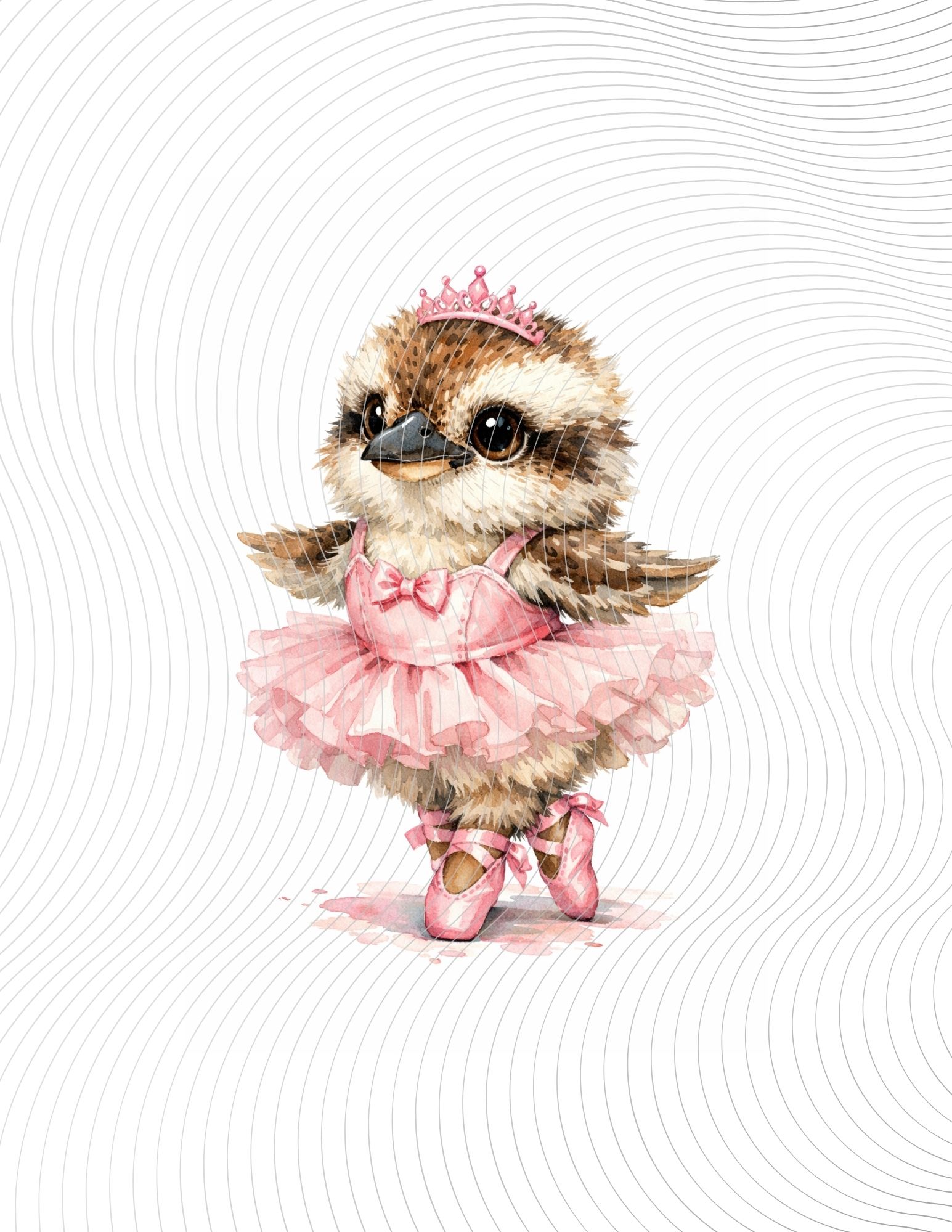 A baby kookaburra ballerina wearing a pink tutu, tiara, and ballet shoes, delicately posing in a whimsical watercolor style.