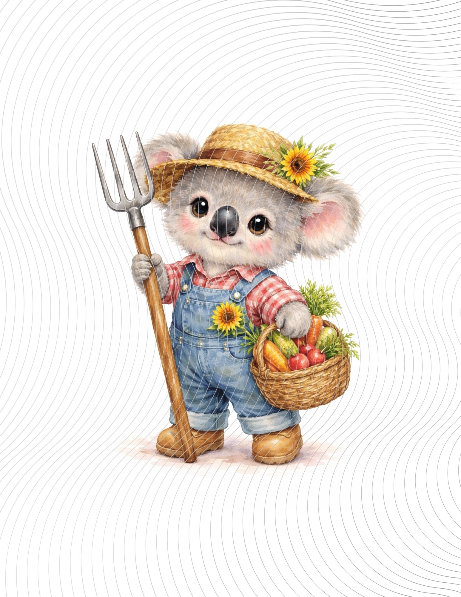 Smiling baby koala farmer in overalls, holding a pitchfork and veggie basket, radiating wholesome countryside charm.