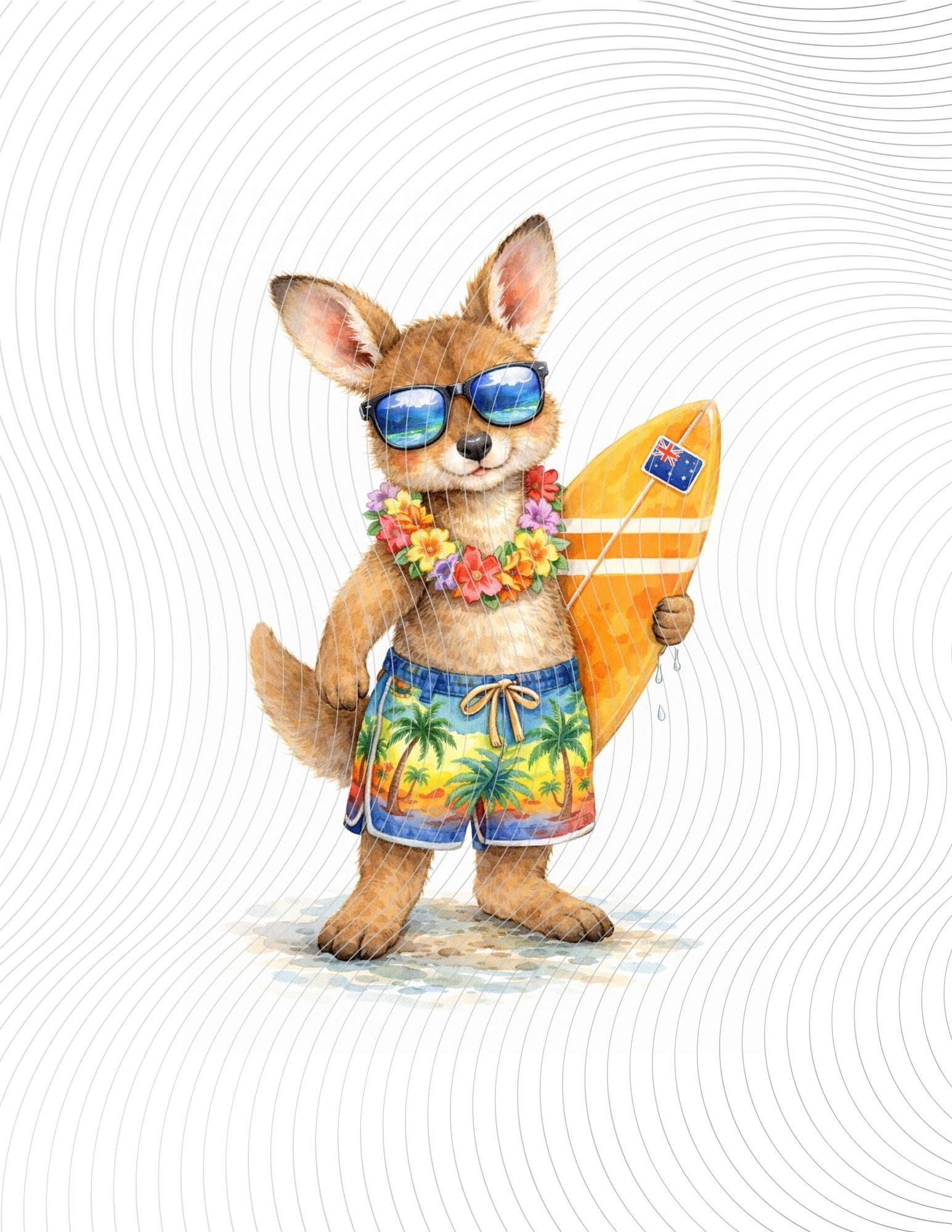 Cool baby kangaroo surfer wearing sunglasses and floral lei, holding an Australian surfboard, beach-ready and confident.