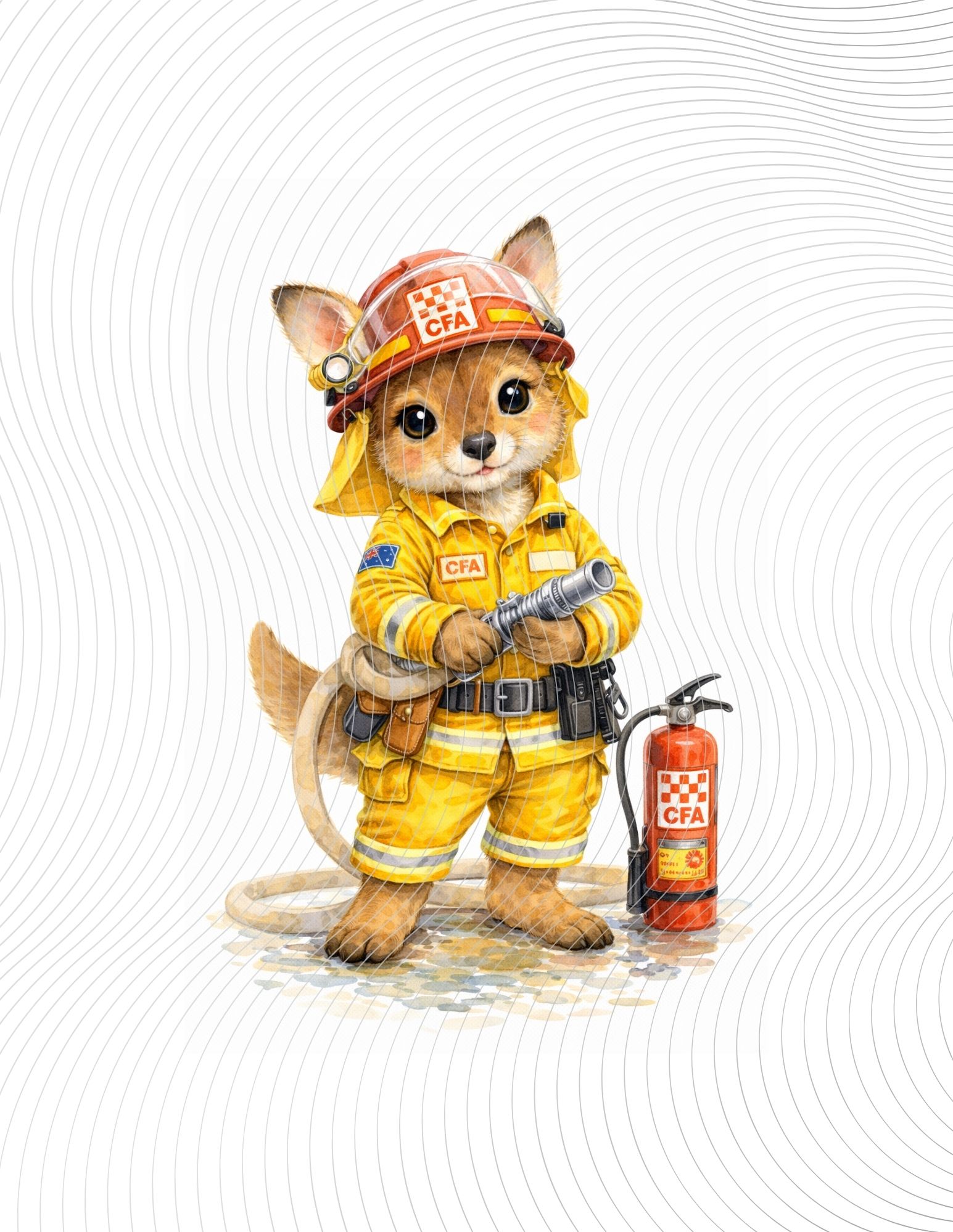 Cute baby kangaroo firefighter in yellow CFA gear, holding a hose, standing proudly beside a fire extinguisher.