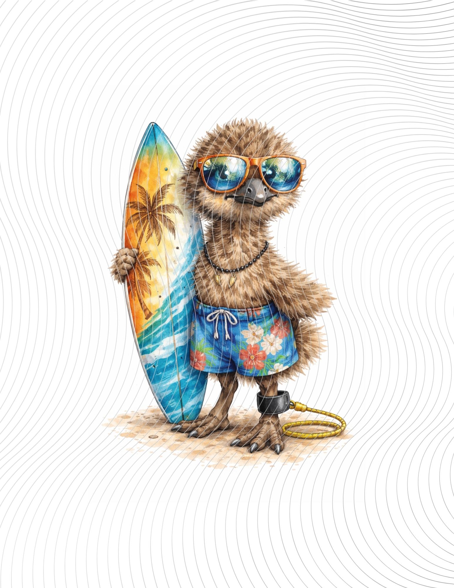 Cool baby emu surfer wearing sunglasses and floral shorts, holding a colorful surfboard, beach-ready and effortlessly stylish.