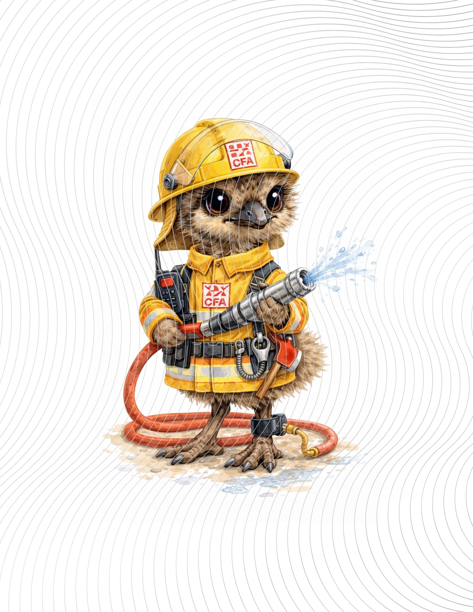 Cute baby emu firefighter in yellow gear, spraying water confidently, tiny boots planted, proving bravery comes in fluffy packages.