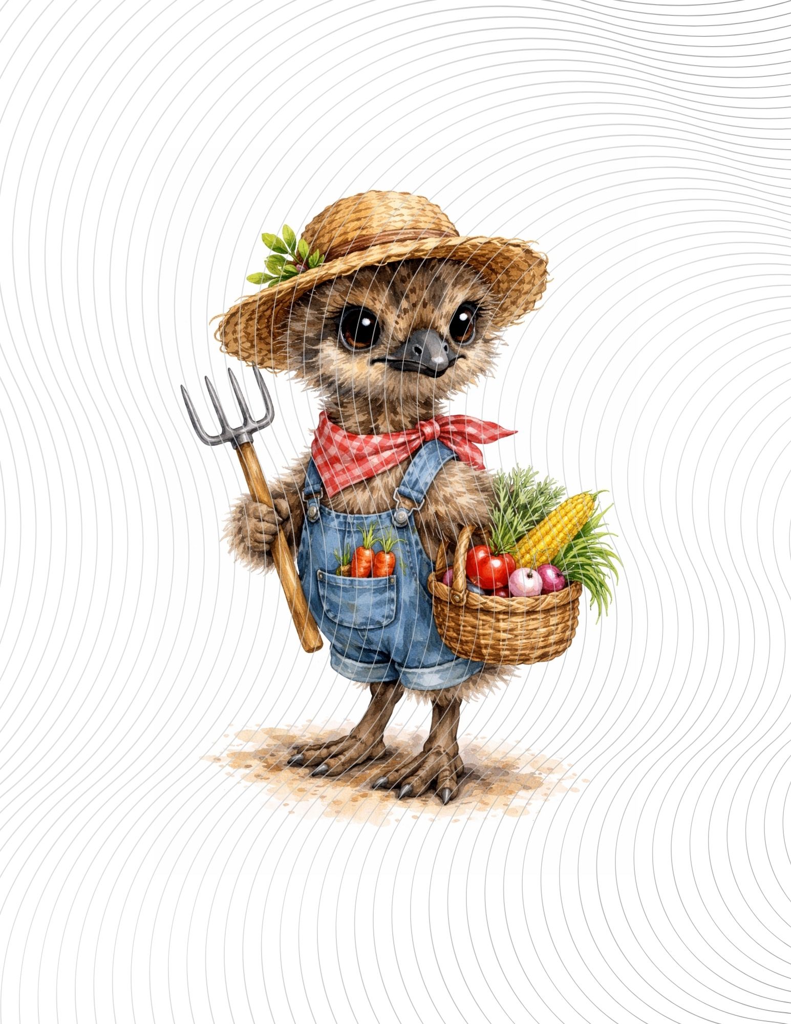 Adorable baby emu farmer wearing overalls and straw hat, holding pitchfork and vegetable basket, radiating rustic charm.