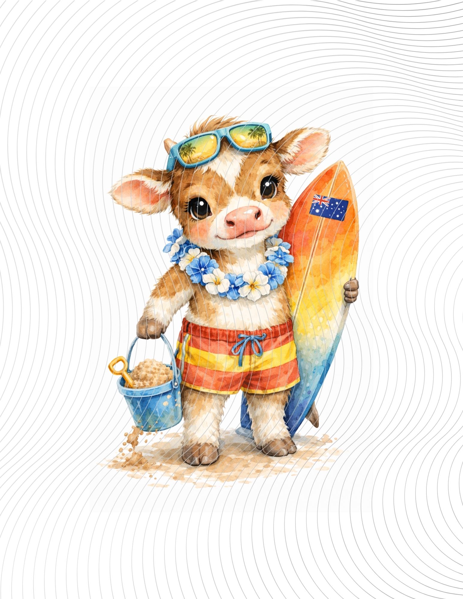 Cute baby cow surfer wearing sunglasses and floral lei, holding a surfboard and sand bucket, beach-ready and smiling.