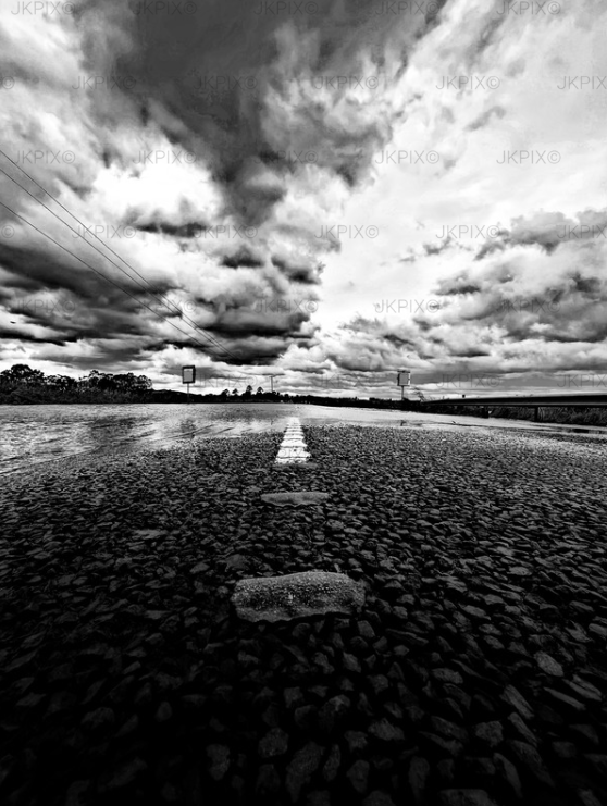 A road stretches forward beneath a sky boiling with heavy, churning clouds, as if the atmosphere itself is gearing up for something wild. Shot from an ultra-low angle, the coarse texture of the asphalt dominates the foreground, leading the eye toward the storm-laden horizon. The white centerline becomes a guide into the oncoming chaos, while the monochrome palette amplifies the tension and raw energy of the scene. It’s a moment caught between calm and eruption—a road inviting you forward just as the sky threatens to swallow it whole.