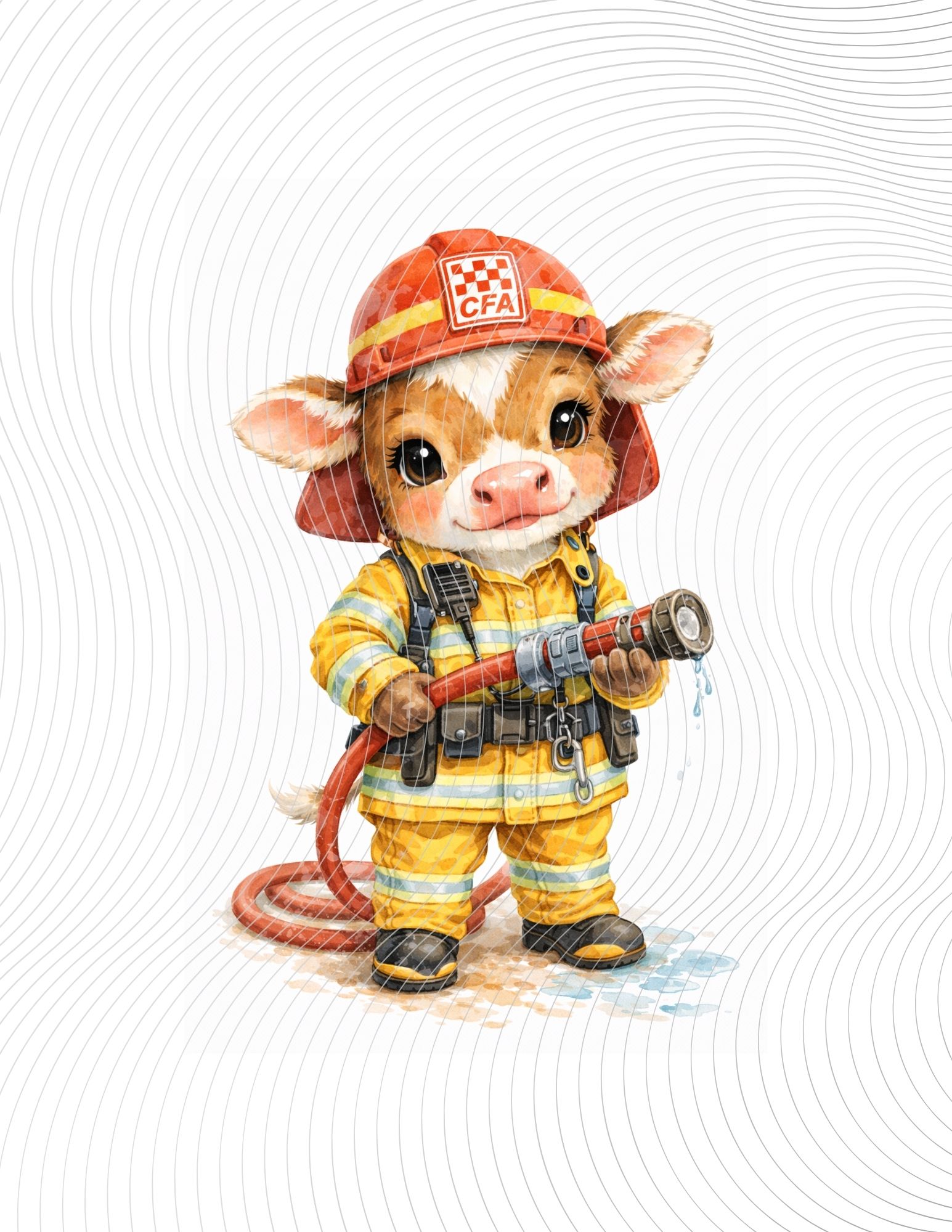 Adorable baby cow firefighter in yellow gear, holding a hose, wearing a helmet, brave expression, watercolor storybook style.