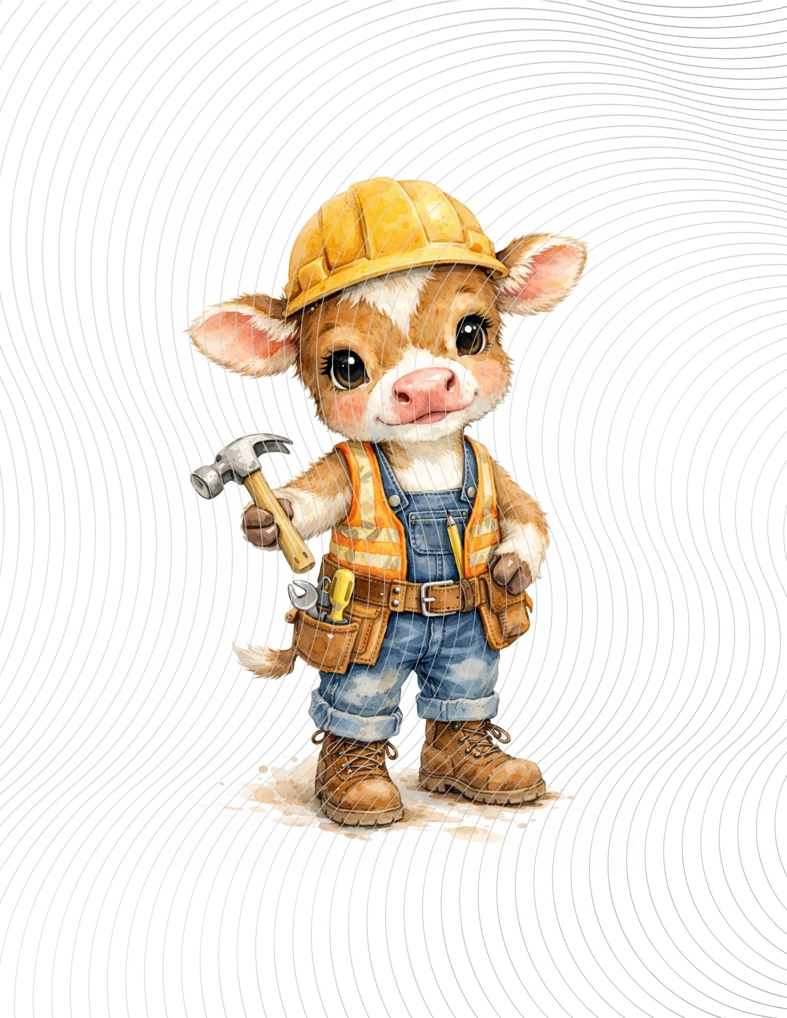 Cute baby cow construction worker wearing a hard hat and safety vest, holding a hammer, smiling confidently in soft watercolor style.