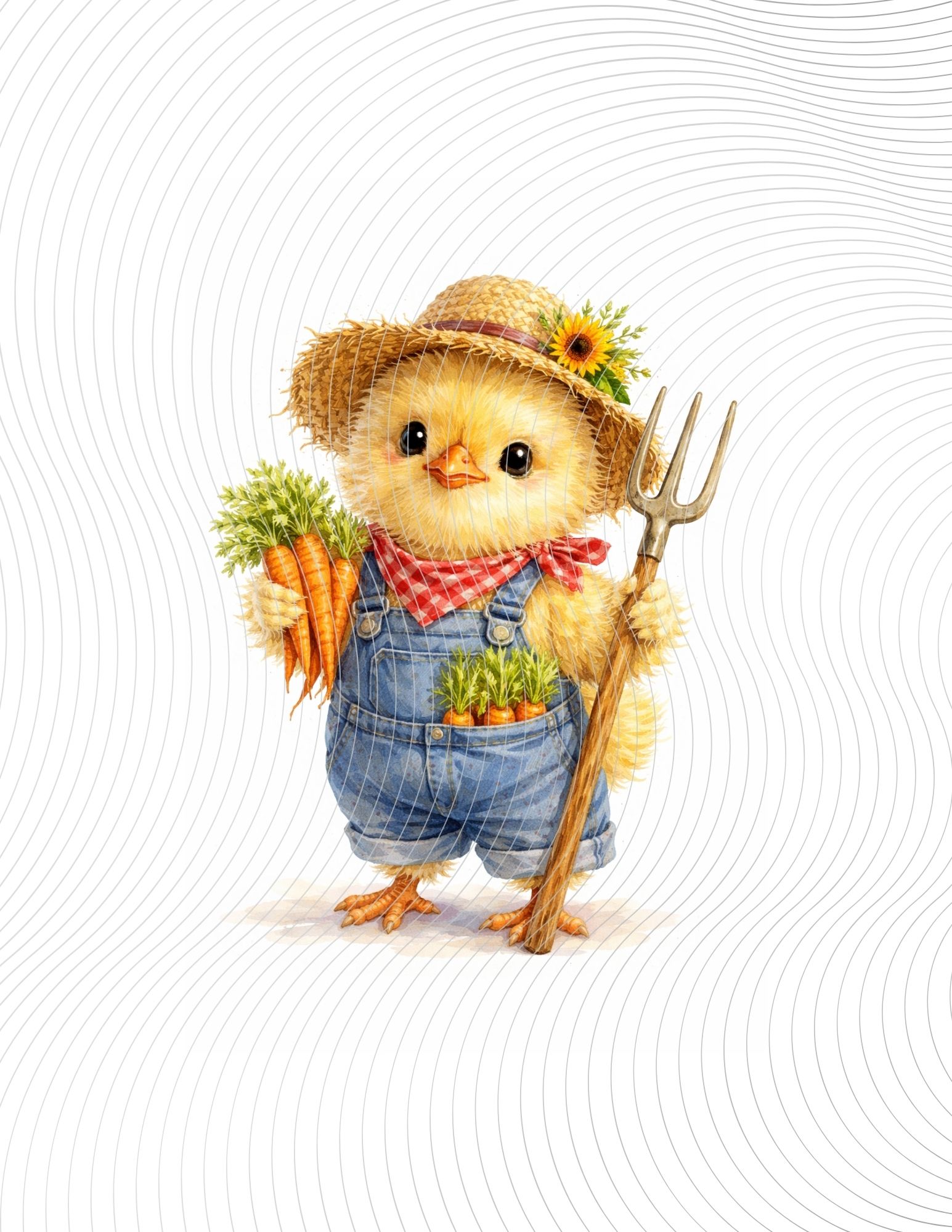 Adorable baby chick farmer in overalls, holding carrots and a pitchfork, radiating wholesome countryside charm.