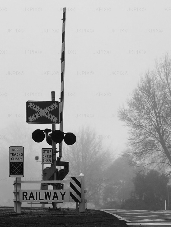 A railway crossing stands silent in the thick morning fog, its striped barrier raised and motionless. The warning lights, signs, and metal framework appear as stark silhouettes against the muted haze, giving the scene an eerie stillness. Bare winter trees fade softly into the mist behind the crossing, their branches dissolving into the pale backdrop. The road curves quietly beside the tracks, empty and expectant, as though the world is holding its breath. It’s a moment suspended between calm and caution—where visibility thins and every shape feels a little ghostlike.