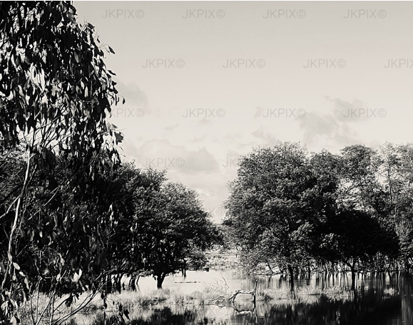 A cluster of trees stands quietly in shallow floodwater, their reflections rippling softly across the surface. Sunlight breaks gently through the clouds, illuminating parts of the landscape while leaving others in shadow, creating a serene balance of contrast. The foliage frames the scene on either side, drawing the eye toward the calm water pooled beneath the branches. The monochrome tone adds a sense of quiet nostalgia—as if time has slowed and the world has paused just long enough for nature to catch its breath. It’s a peaceful, contemplative moment where land and water blur into one still, reflective space.